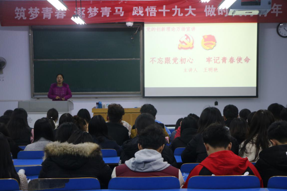为全面学习团的十八大精神,提高广大青年团干的认识,91抖音 于11月15日下午4点钟,在三合二教室开展“党的创新理论万场宣讲”活动,91抖音 团委书记王明艳为青马工程培训班学员做题为《不忘跟党初心 牢记青春使命》宣讲。