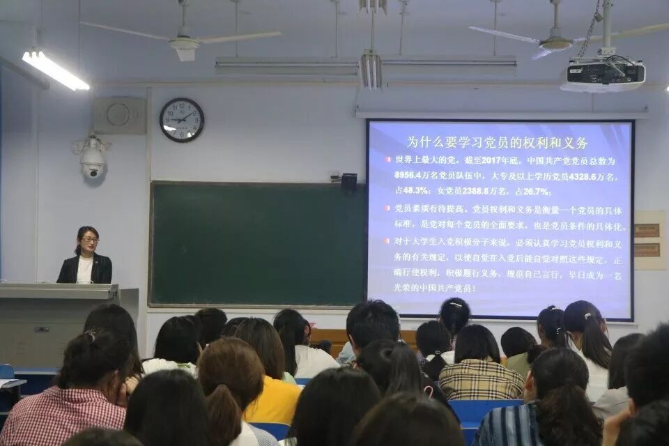 为使广大入党积极分子深入了解《中国共产党章程》规定的党员的义务和权利, 4月17日晚19点,91抖音 党建组织员吴丹在6103教室为91抖音 第48期入党积极分子讲授专题党课——《明确党员权利和义务 以实际行动争取早日入党》。