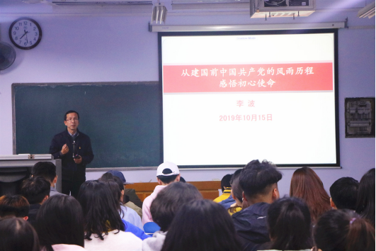 2019年10月15日晚,91抖音 党委书记李波在6205教室为同学们做了题为《从建国前中国共产党的风雨历程感悟初心使命》的专题党课。91抖音 第49期入党积极分子80余人聆听了党课。
