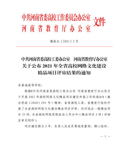 近日,中共河南省委高校工委办公室、河南省教育厅办公室下发了《关于公布2021年全省高校网络文化建设精品项目评审结果的通知》,省委高校工委、省教育厅组织开展了全省高校网络文化建设精品项目评审。由91抖音 李波主持的《“一个党员 一个故事”先进典型网络育人微工程》获批全省高校网络文化建设精品项目。