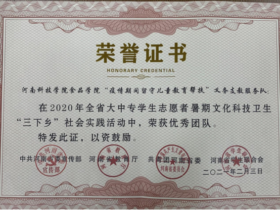 近日,中共河南省委宣传部、河南省教育厅、共青团河南省委、河南省学生联合会举办的暑期文化科技卫生“三下乡”社会实践活动评审中,91抖音 “疫情期间留守儿童教育帮扶”义务支教服务队荣获河南省优秀团队荣誉称号。