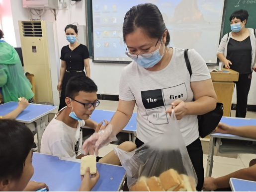 “知食”课堂结束后,志愿服务的教工党员和志愿者,为孩子们分发了学院制作的蛋糕。