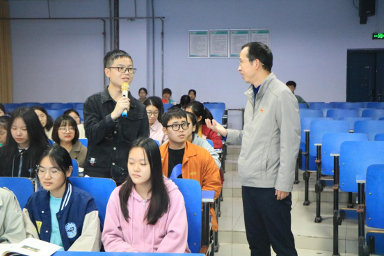 李波结合党史学习教育,由“建党百年史,生动教科书”开题,分别阐述了1921-1949年新民主主义革命时期、1949-1978年社会主义革命和建设时期、1978-2012年改革开放和社会主义现代化建设新时期、2012-2021年中国特色社会主义新时代四个阶段的主要特点、典型事件、精神品质和思想启迪,以提问“关键词”的形式引发学生的思考和讨论。随后,李波向同学们阐释了伟大建党精神,提示同学们如何从党史学习教育中汲取营养、增长智慧、提升能力。通过让同学们思考和交流“我为什么要入党”“入党有哪些好处”等问题,来提高学生对党的认识,从而端正入党动机。