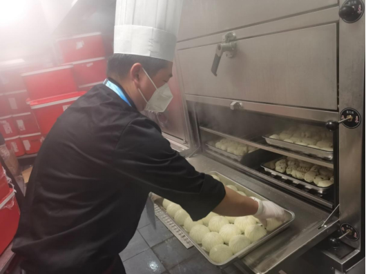 由于具有烘焙方面的丰富经验,他和另外9人负责饼房。赵煜说,每天的午餐和晚餐,就餐者达两千多人次,赵煜他们提供的食品,主要是黄油蛋糕、牛角面包、慕斯、包子、花卷等等。“冬奥会的食品,绝大部分是集中配送的。我们的主要任务是二次加工,比如分装、加热、摆盘等等。”赵煜说,冬奥会供餐,有严格的标准和程序。除了加工餐品,还要注意食品的储存,餐具的消毒等等。在饼房工作,必须一丝不苟,严格按照规定和流程,提供卫生、可口的餐品。