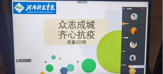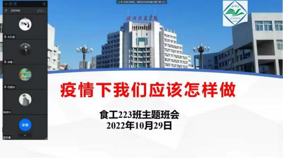 本次主题班会活动中,各班以“坚定、坚持、坚守、坚信”、“抗击疫情,慎终如始”、“疫情防控不松懈,抗疫成果共守护”等为主题,从以下几个方面向同学们提出建议和要求:一是传达新乡市教育系统新冠肺炎疫情防控工作专班办公室《关于进一步加强在新高校外卖快递管理的紧急通知》的要求,要求同学们不点外卖,减少网上购物,严格遵守学校疫情防控要求;二是建议同学们趁此机会,静心学习,认真上好网课,明确自己的学习目标,努力奋进;三是希望同学们坚持非必要不请假出校园,如确有特殊情况,要严格履行请假手续;四是鼓励学生党员、班干部、宿舍长做好榜样带头作用。