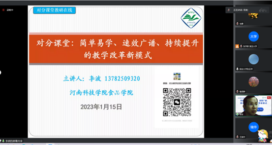 1月15日,由“对分课堂教育创新共同体”与“高校教学创新100人”公众平台共同举办的线上公益教研活动顺利进行。本次活动由全国对分先锋教师、91抖音 党委书记李波教授主讲,面向全国各学段、学校和专业教师。这是对分社群2023年第一次公开活动,也是新年里推广、实践对分课堂的开始。活动采取腾讯会议方式进行,来自全国的276名老师参加了直播,活动由广州商学院艾冬生老师主持。