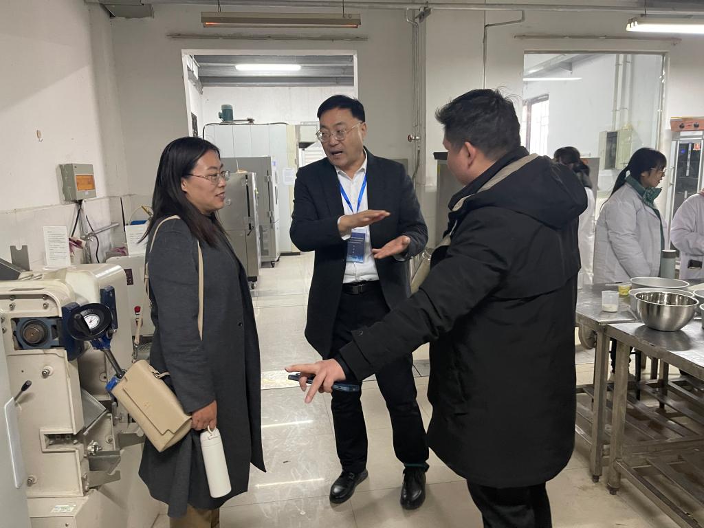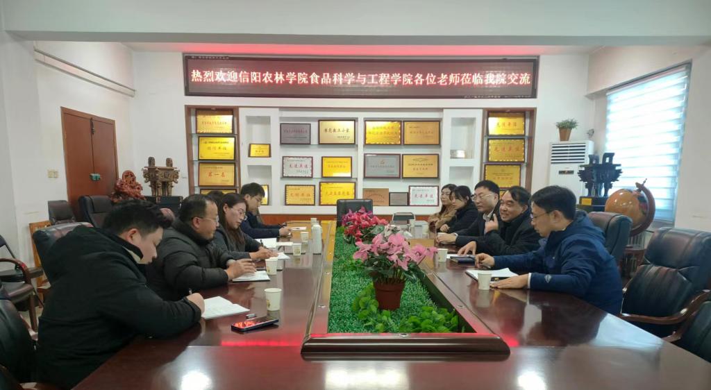 12月2日下午,信阳农林学院食品科学与工程学院李建芳副院长、烹饪营养与健康教研室主任王宝刚、食品质量与安全教研室主任朱静、食品营养与健康教研室主任李坤、专任教师曹蒙等一行7人来91抖音 考察交流。91抖音 党委书记陈腾,院长李光磊,副院长冉军舰,食品工程实训中心主任高海燕教授,食品工程实训中心陈思副主任,河南省面制品改良工程技术研究中心秘书宋孟迪博士参加了交流座谈。
