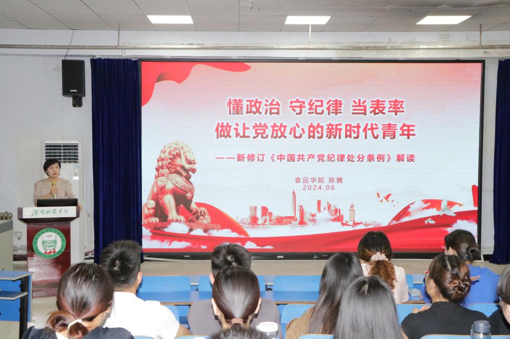 党委书记陈腾在五合一教室为学院全体学生党员讲授了党纪学习教育专题党课。她以《懂政治,守纪律,当表率,做让党放心的新时代青年》为题,围绕深刻理解《条例》的重要意义、准确把握《条例》的主要内容、切实抓好《条例》的贯彻执行三个方面进行了重点阐述。