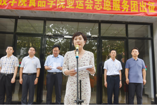 学生代表贺佳静代表志愿服务团进行了发言,她表示志愿服务团将勇于奉献、勤奋学习,珍惜机会、实现价值,怀抱梦想、脚踏实地,不辜负学校和学院的期望和重托,以昂扬向上的精神风貌圆满完成此次任务。