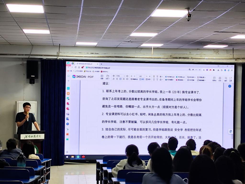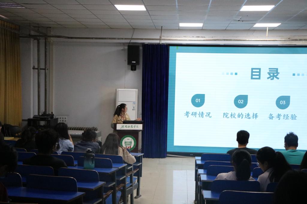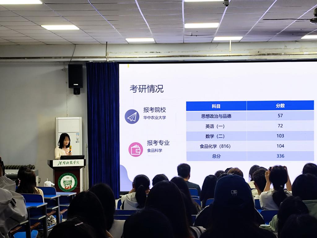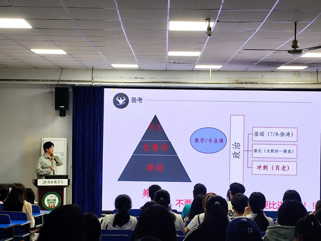 会上,卢尤雅强调了考研对个人成长和未来发展的重要性,并呼吁同学们保持积极的心态,勇敢迎接挑战。随后,拟录取的毕业生分别就目标院校选择、专业方向确定、考试科目复习、备考策略制定以及心态调整等方面进行了深入的分享。他们结合自身的考研经历,为现场的同学们提供了切实可行的建议和方法,也多次赢得了热烈的掌声。